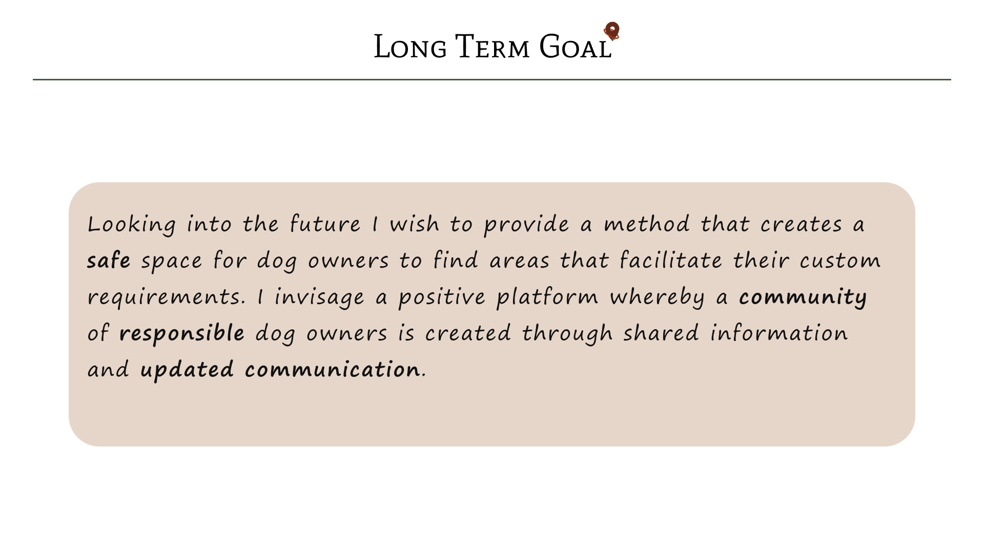 In summary, I have seen that my app would be a helpful tool in building a safer, more educated community of dog owners, and in turn aids the problem of dogs and their owners being unable to find areas that accommodate their specific needs. Dog owners are given a multitude of options to suit their needs in order to make spending time with their dog all the more enjoyable and stress-free. Gaining respect and understanding for rules, regulations and the needs of others, will help make the dog community a more positive place. My app will help to achieve this, by providing the necessary knowledge and requirements of the areas before owners attend; bringing like-minded people together.