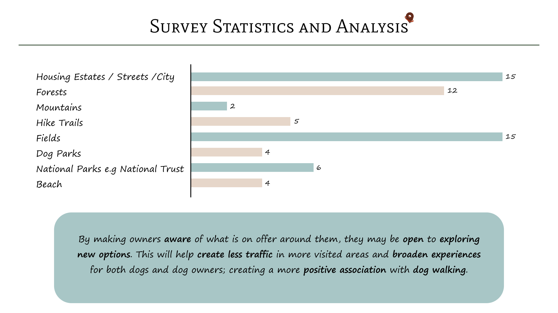 Through the discovery phase of the project, I focused on researching on the topics of issues dog owners have. Whether those issues were with their own dog or with other dogs. I looked at the issue of not having the correct facilities on offer in public places, the issues around regulations for dog friendly vs not dog friendly areas, and I delved into what makes a walk a success for different owners. I produced a survey which gave me great insight into the different lives and requirements different dog owners have for a successful walk with their dog. The survey highlighted that the majority of altercations occur through a lack of responsibility and respect for the rules of certain areas. The data produced, reflected that laws and regulations need to be enforced around dog ownership to create a positive dog community. I decided to complete a competitive analysis to understand what apps like mine, are currently on the market; PawParks is an app that shows dog parks around the location of the user, and BringFido is an app that provides the owner with dog friendly hotels, restaurants, activities and parks around the area they choose. I used the positive qualities from these apps, to help influence my app.