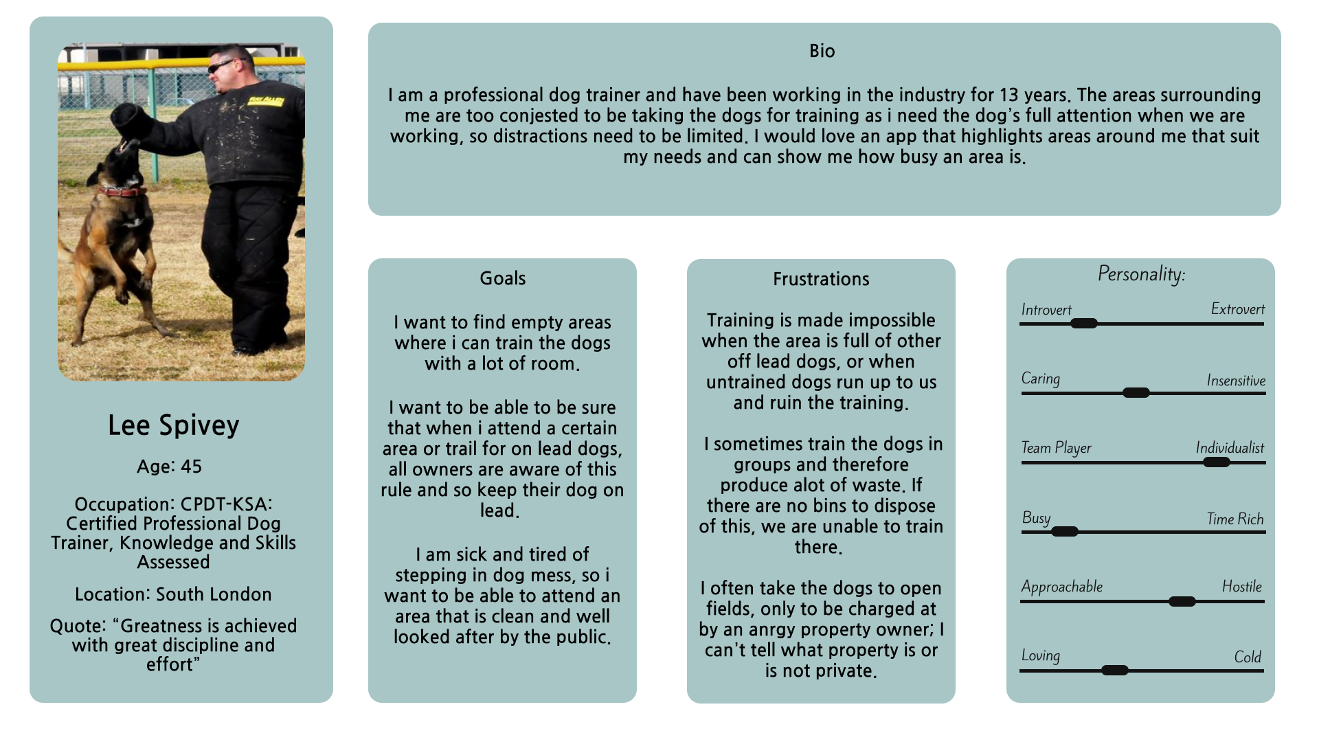 Within the definition phase of the app, I created two user personas to show the diversity my app aims to include. The first user persona is of a professional dog trainer who would love an app that highlights areas around him that suit his needs and show him real time statistics of people traffic in an area. The second persona is reflective of a stay-at-home mum who owns an overly friendly golden retriever. She would like an app to show her the rules and regulations of areas so she can walk safely with no altercations. After deciding what I wanted to achieve with my app - to show users more areas to visit that meet their needs and to create a positive, informative community of owners - I decided that the task for the interviews would be to log into the app, look at the menu and their profile, and complete a walk somewhere near them. I have linked the site map for the application, which shows the different parts of the app.